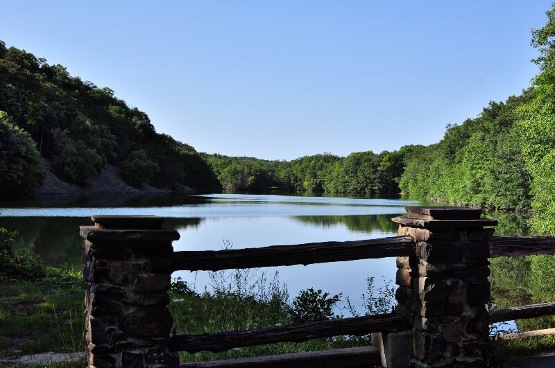 This big dam is 135 feet high and stretches nearly half a mile across. A cone-roofed tower stands out in the middle of the forest. The dam itself blends right into the woods.
